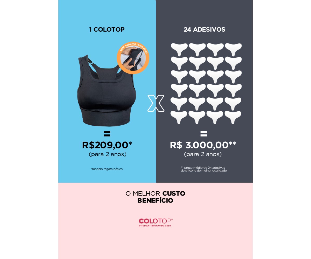 O Colotop Regata Básico é o líder de vendas entre os tops antirrugas. O produto foi desenvolvido para prevenir e reduzir linhas de expressão no colo ao dormir.
